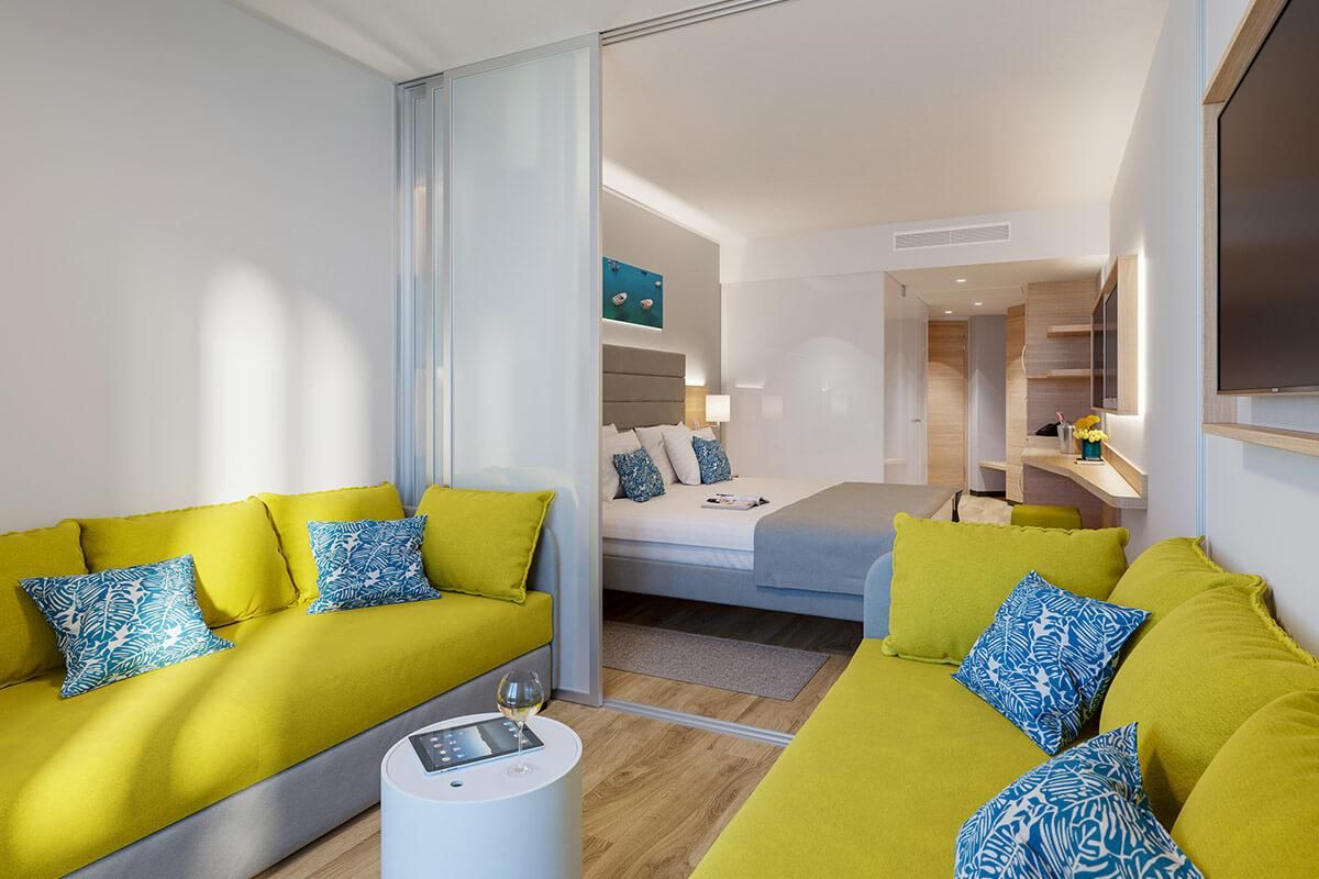 JUNIOR SUITE 2+2, veličina 28-32 m2, morska strana, balkon, spavaća soba s bračnim krevetom ili odvojenim krevetima (180x200), dnevni boravak s kaučem, kupaonica s kadom, klimatizacija, detektori dima, LED SAT TV, dječji TV program, sef, sušilo za kosu, set za obitelj: dječji sapun i Maro activity book, zaštitni ulošci za strujne utičnice, telefon s izravnim biranjem, utičnica 220V, Wi-Fi pristup Internetu, tepih
